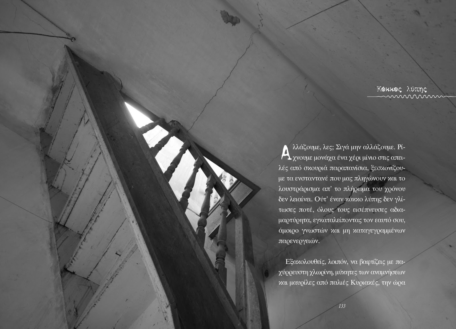 Εξακολουθείς, λοιπόν, να βαφτίζεις με παχύρρευστη χλωρίνη, μύκητες των αναμνήσεων και μαυρίλες από παλιές Κυριακές, την ώρα που δεν σε βλέπει κανείς και κρίνεις εσφαλμένα πως δικαιούσαι να γυρνοβολάς εκείνες τις παλιές παντόφλες, που έρπουν στα παρελθόντα και τα μαλλιά σου αχτένιστα, χαρακτηριστικά μακριά από καθρέφτες κι απρόβλεπτες μικρές ενοχές.